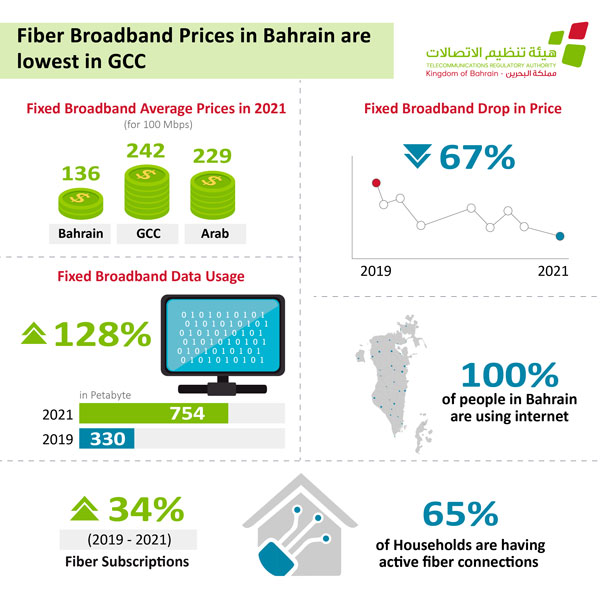 In addition, Bahrain's telecom operators compete on a regional and Arab level for mobile services, particularly in charges of the high-usage packages. Bahrain's fixed broadband charges for high speeds have been reduced by 67% between 2019 and 2021, according to the study.